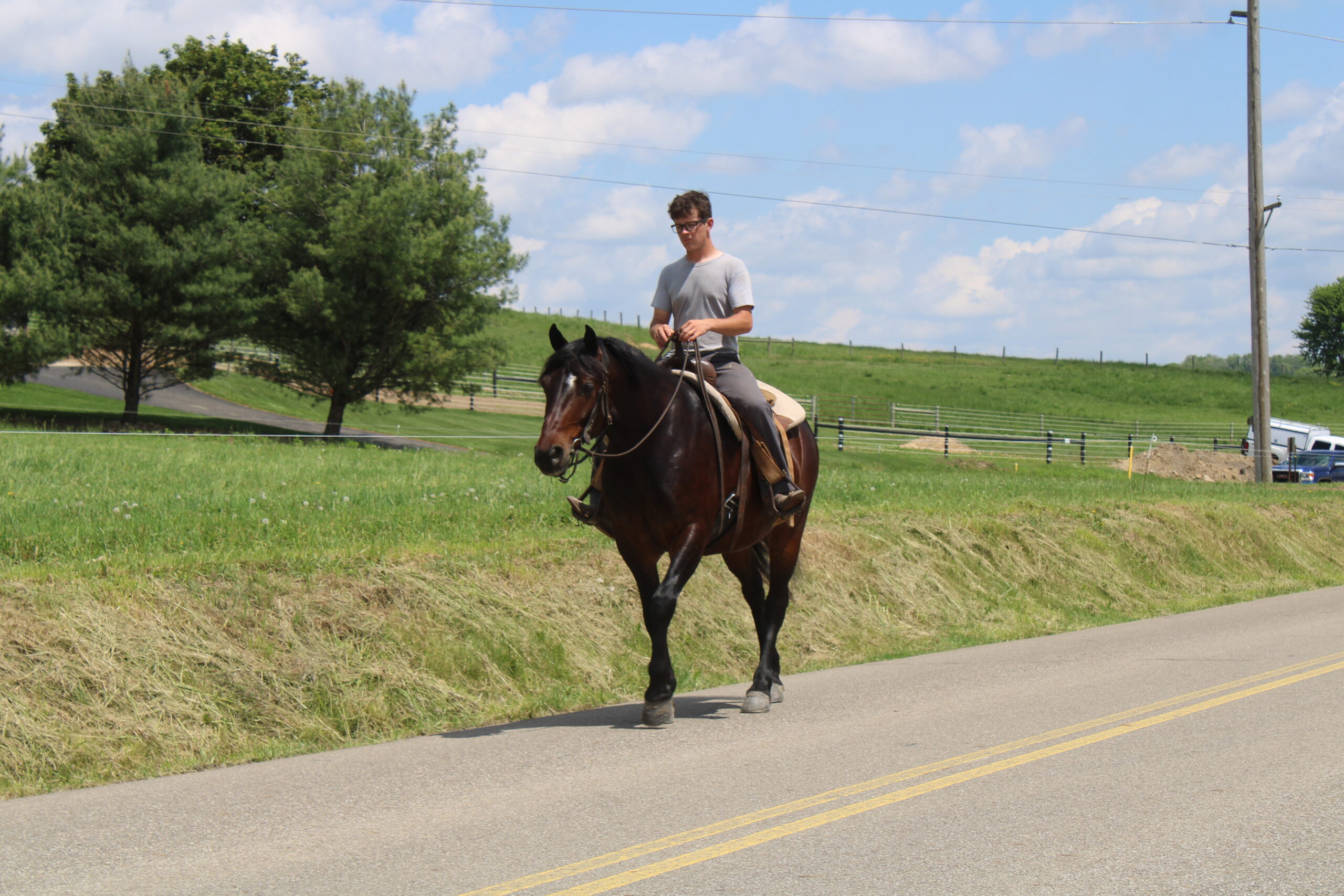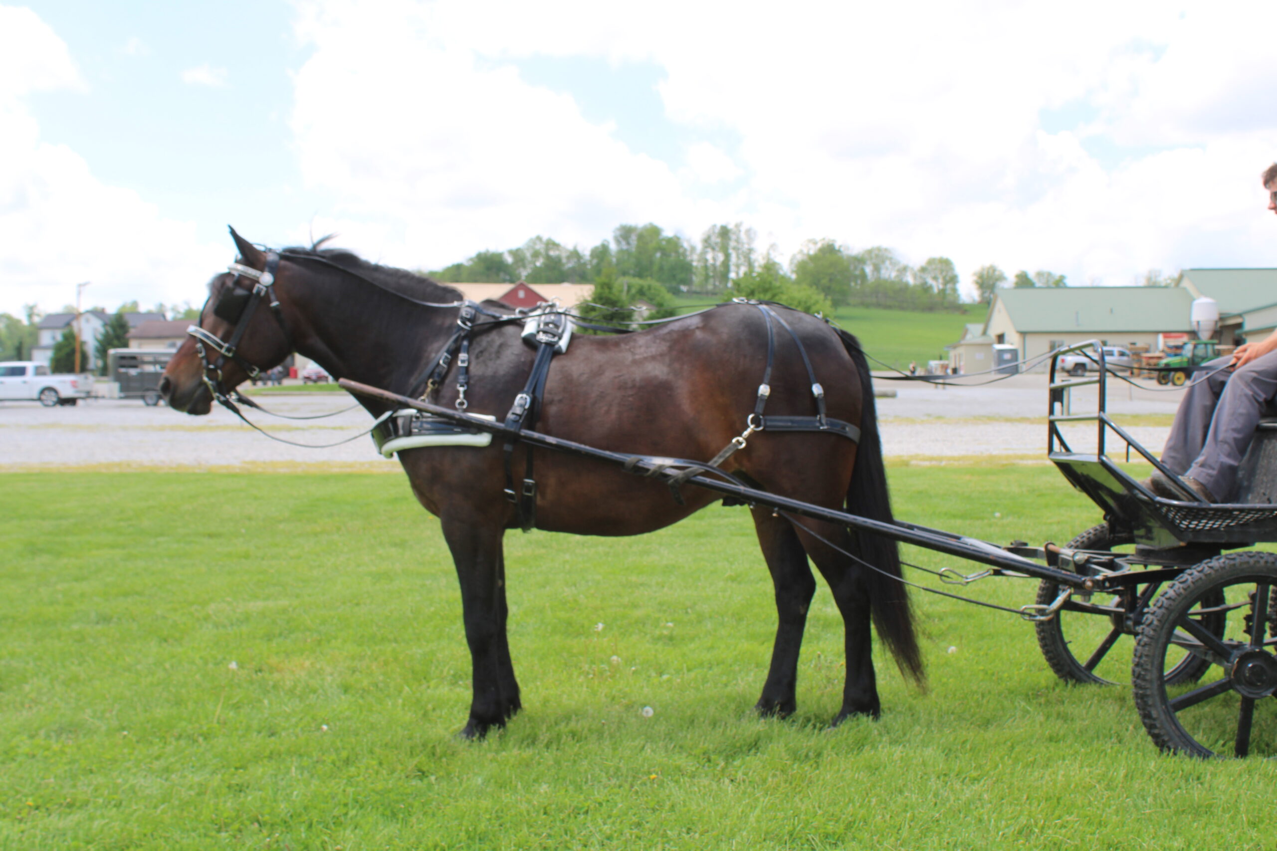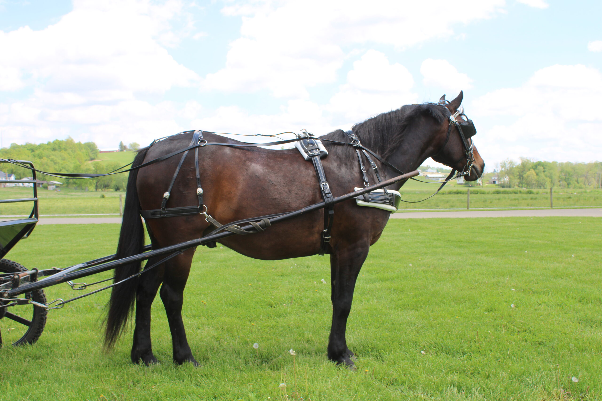 Hershy's Lucky is a Quarter horse, Draft pony cross gelding. He is 6 years old and broke to ride and drive single or double. Lucky has a very quiet temperament and a very good personality. Lucky is broke for the kids and still big enough for an adult. Lucky does not mind if you ride him with a saddle or without a saddle or if there is 1 or 2 people on his back. Lucky would be a good trail horse or a horse to use once a week and know that he will be broke. Lucky will walk, trot, and canter which ever you prefer. He has been on lots of trails and through creeks. Lucky will drive just as good as he rides. Lucky was the horse the children used to go to school with. They knew they could depend on him. He has been out in the traffic doing carriage rides here on the farm. Lucky is a friendly animal and will go wherever you point him. For more info call or text 330-600-0197.