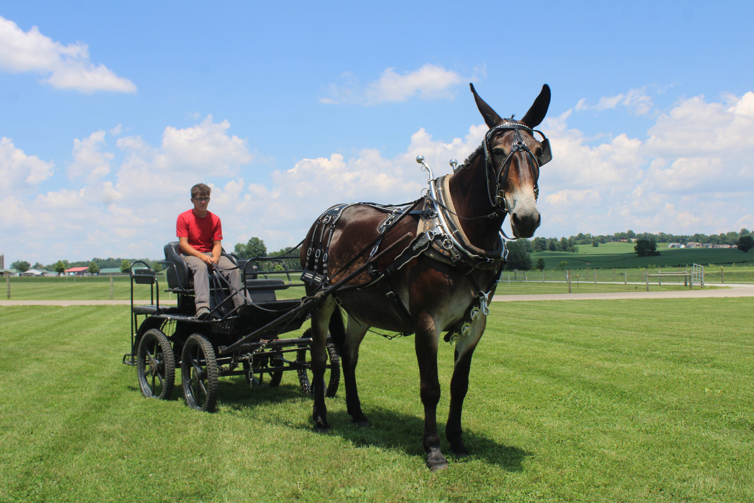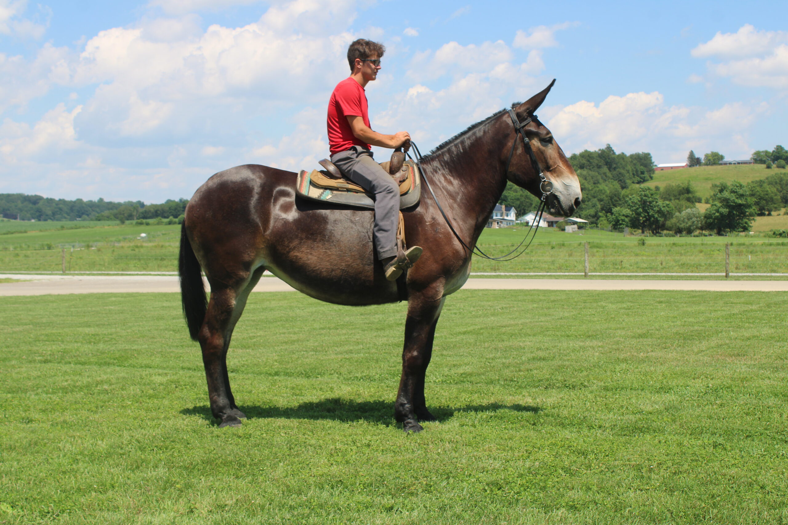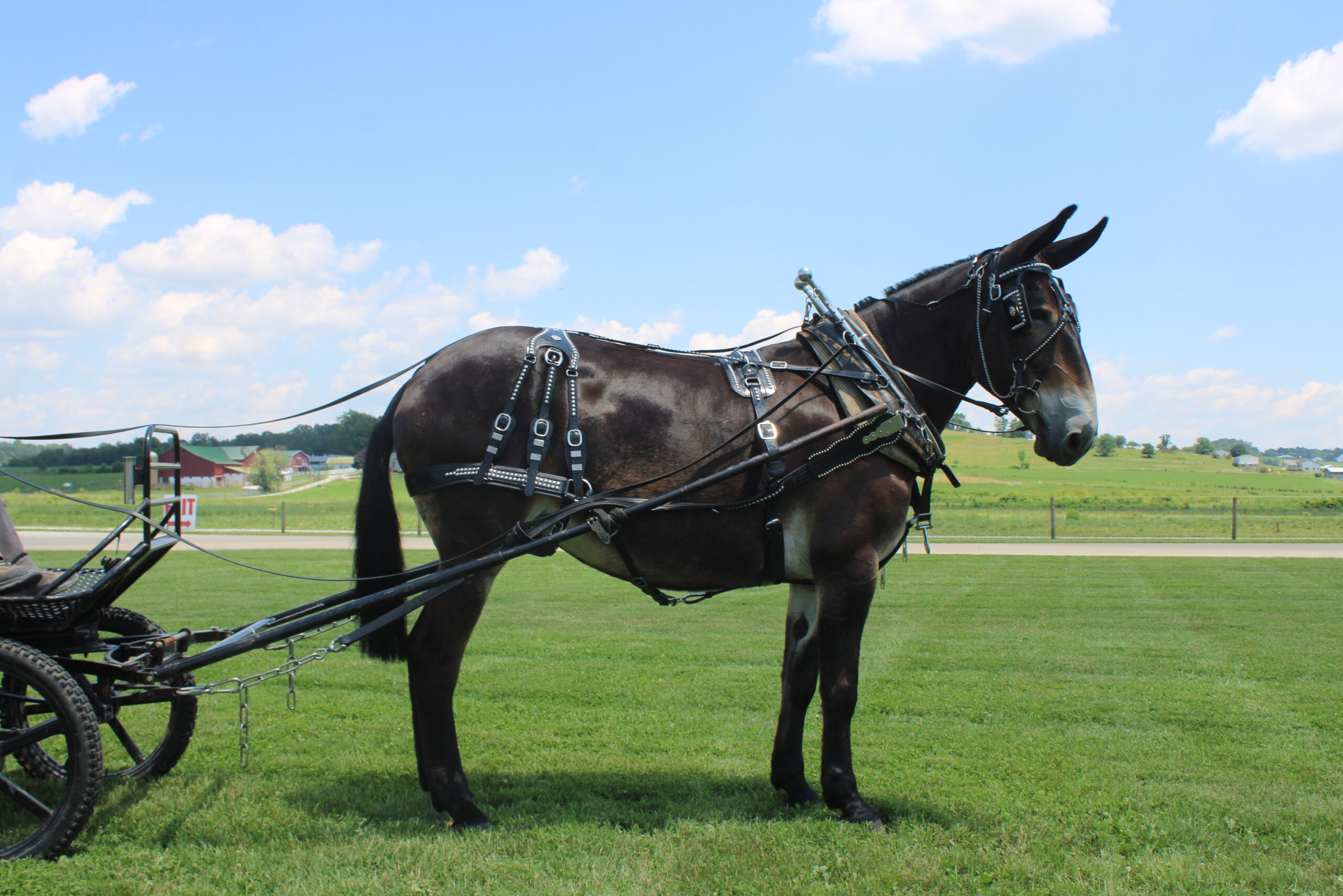 HERSHY'S CHEYENNE Here is a hard to find molly mule. Cheyanne is a very well trained to ride or drive. She has been trail ridden through the woods and is very sure footed. She is used to give rides here on the farm. She gets along great with other animals. In the day time Cheyenne is in our petting area where people come up and pet her plus give her lots of attention. People just get the biggest kick out of being able to touch such long ears. She is the kind of mule that will make the adults smile and the children will giggle with glee. Usually she is doing that about twice a week then on weekends Cheyenne is either giving carriage rides through heavy traffic or in the merry-go-round. She is very gentle and easy going and does well giving rides to kids but is still not too lazy to get out and work as well. She has a nice smooth walk trot and canter and is very easy to ride. She drives real nice single and double and doesn't mind being driven on either side of the tongue. Cheyenne gets along great with our horses and other animals in the pasture. Here is a big nice mule that is broke for anyone!