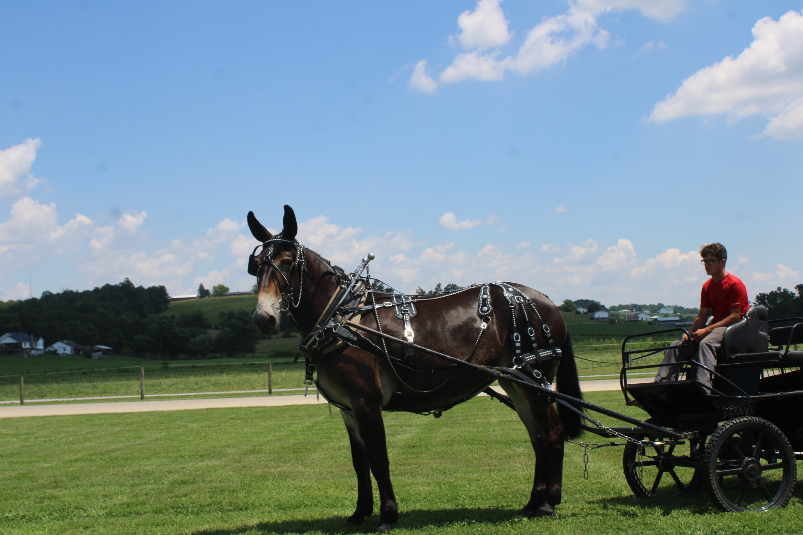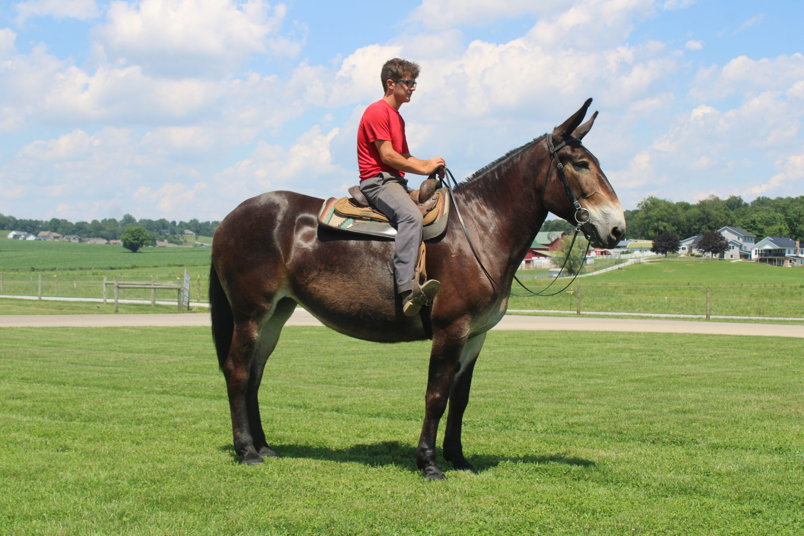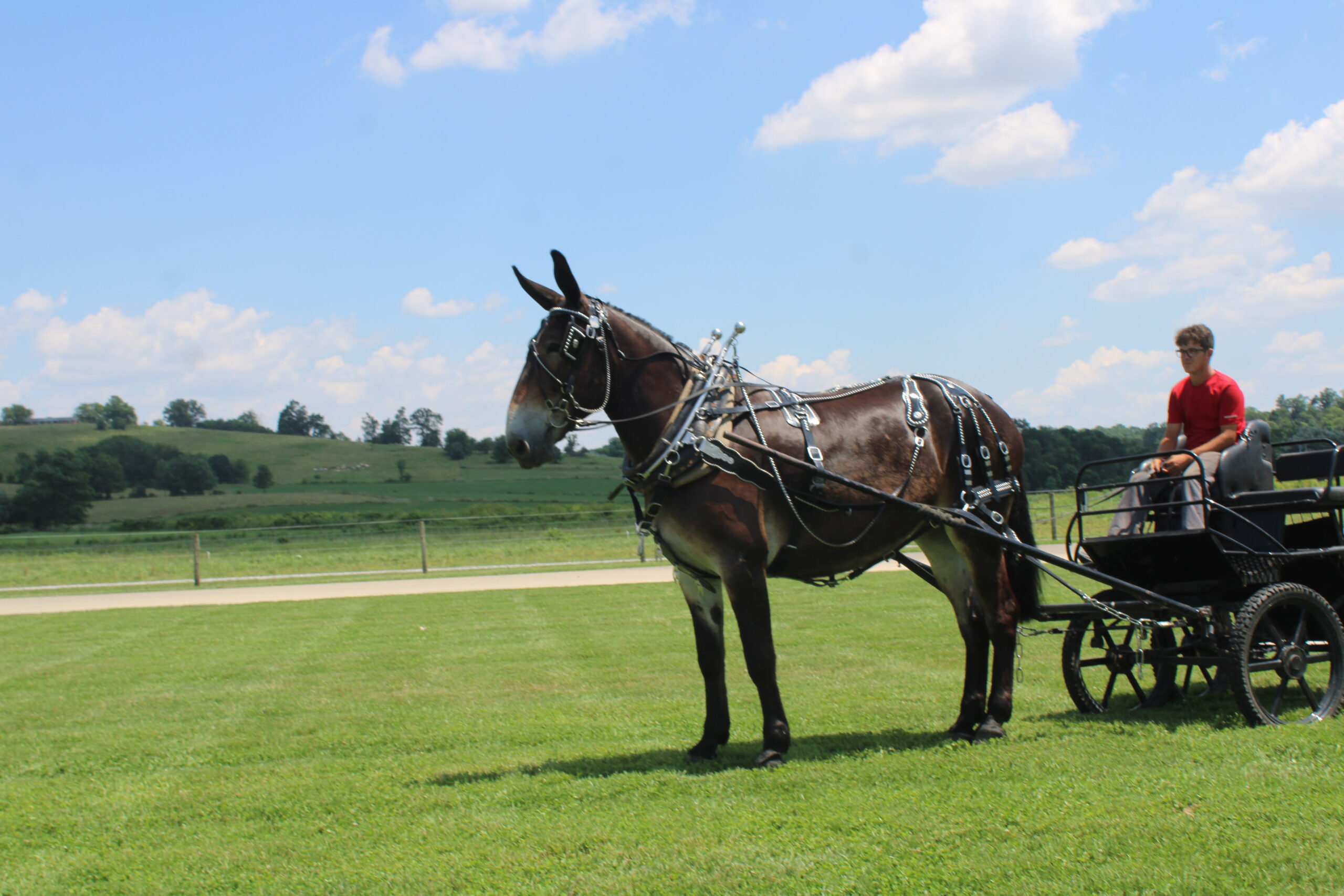 HERSHY'S CHEYENNE Here is a hard to find molly mule. Cheyanne is a very well trained to ride or drive. She has been trail ridden through the woods and is very sure footed. She is used to give rides here on the farm. She gets along great with other animals. In the day time Cheyenne is in our petting area where people come up and pet her plus give her lots of attention. People just get the biggest kick out of being able to touch such long ears. She is the kind of mule that will make the adults smile and the children will giggle with glee. Usually she is doing that about twice a week then on weekends Cheyenne is either giving carriage rides through heavy traffic or in the merry-go-round. She is very gentle and easy going and does well giving rides to kids but is still not too lazy to get out and work as well. She has a nice smooth walk trot and canter and is very easy to ride. She drives real nice single and double and doesn't mind being driven on either side of the tongue. Cheyenne gets along great with our horses and other animals in the pasture. Here is a big nice mule that is broke for anyone!