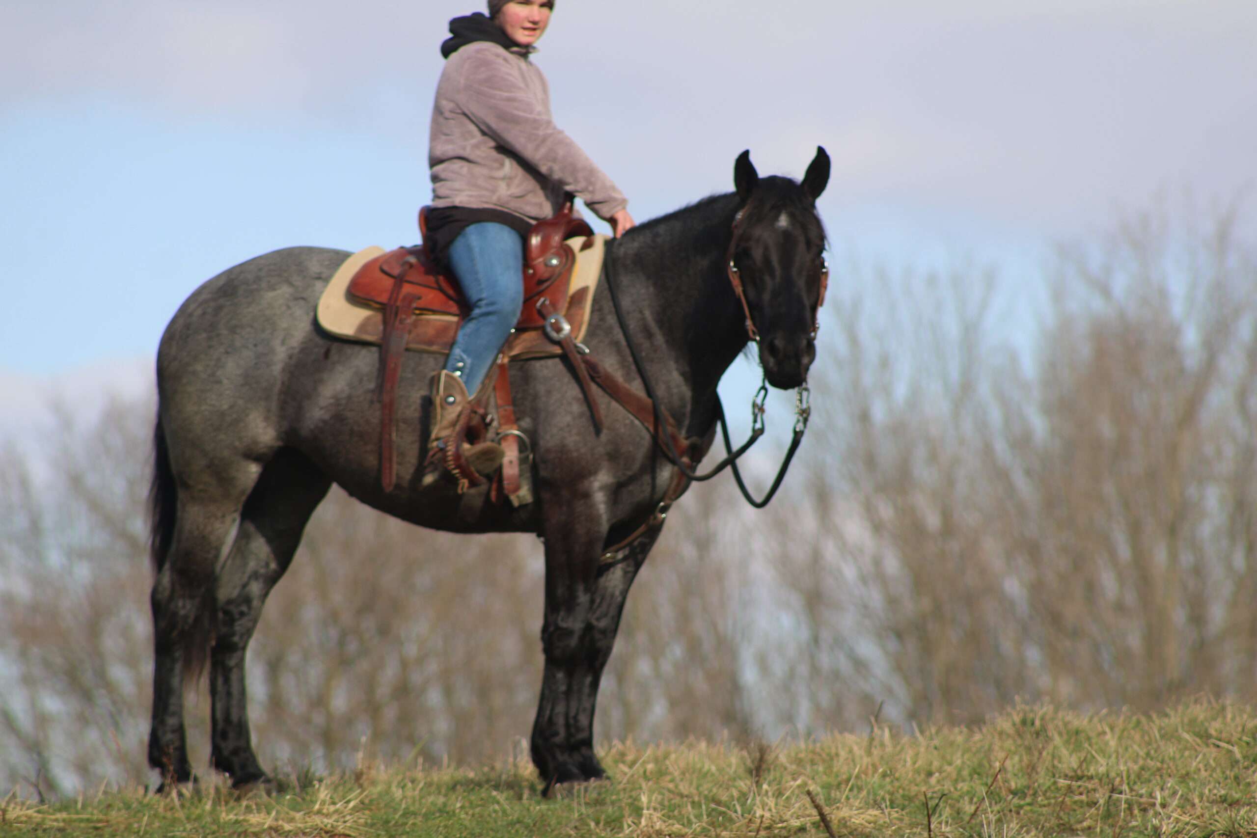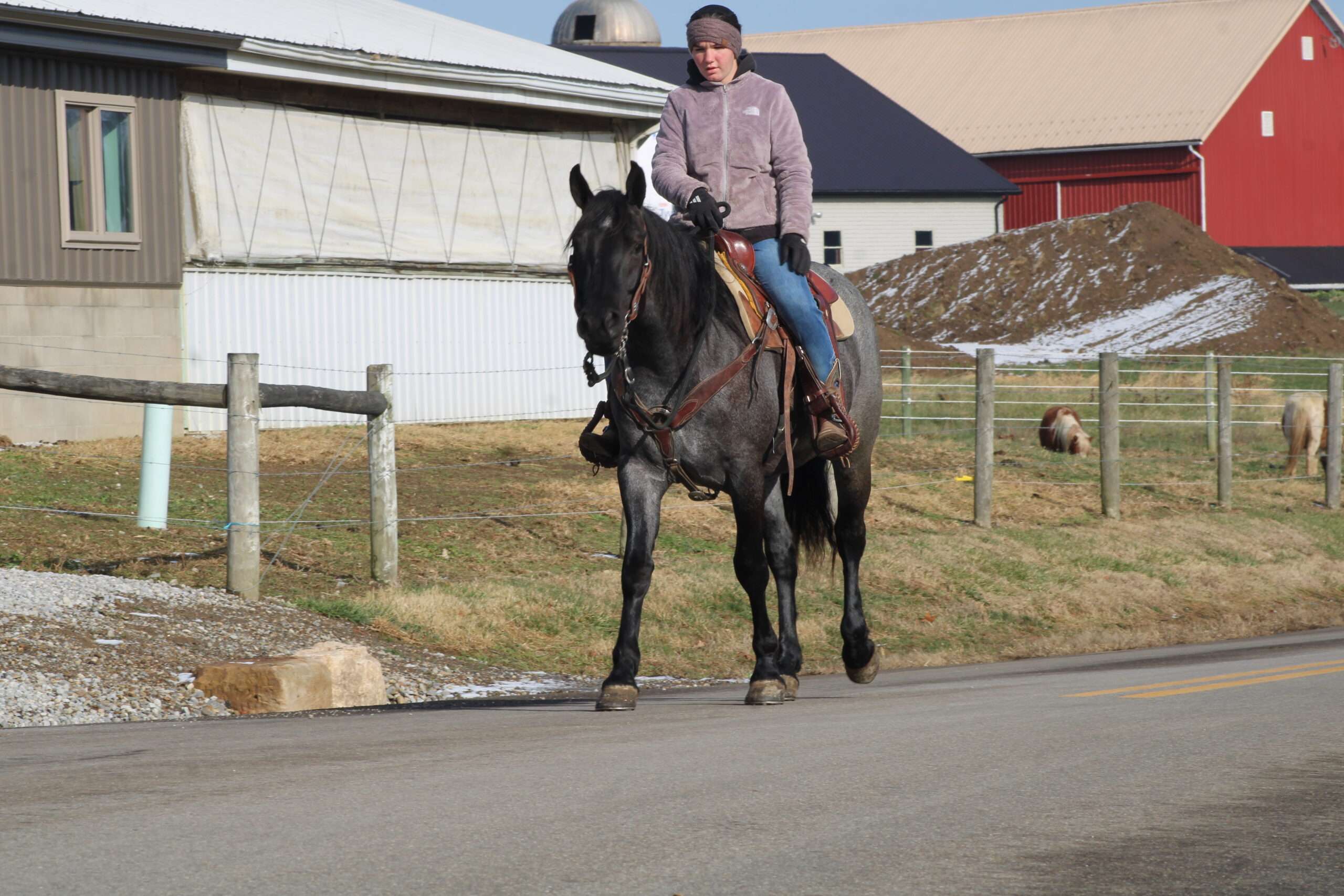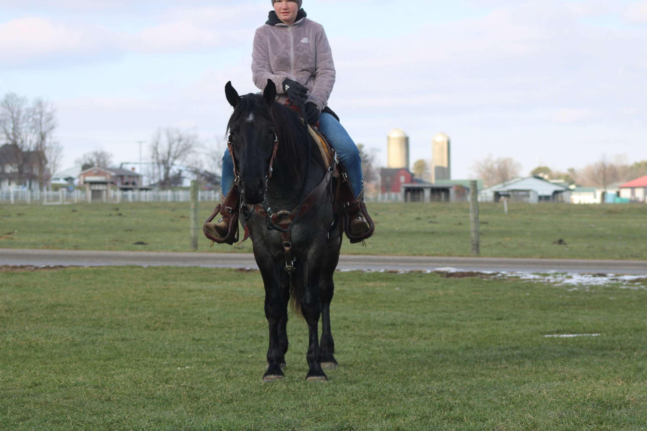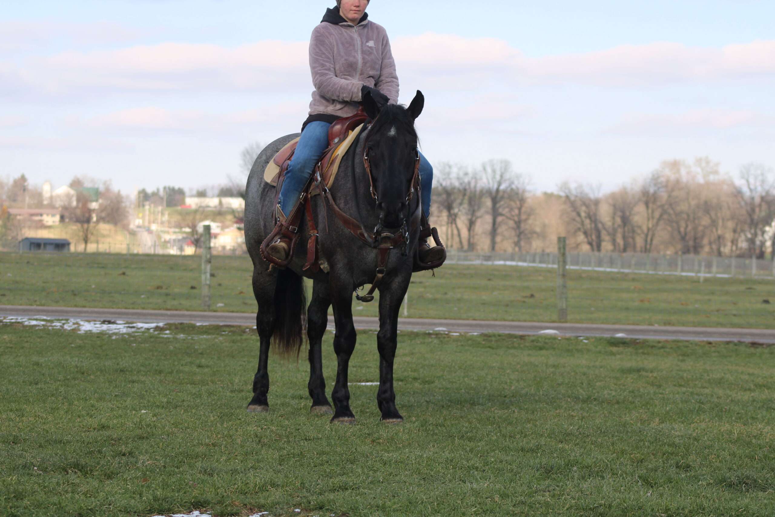 Hershey's Blue Bell is a coming 4 year old Percheron X Quarter Horse mare!! She is very gentle and laid back for her age. "Bell" as we call her most times has been trail ridden a lot and loves to go through water. She is very safe in heavy traffic and doesn't mind the big trucks. Bell picks up both leads and has a nice smooth lope. She stands nice for the farrier and also doesn't mind the clippers. She is easy to catch in the pasture and stands nice to mount. Here is a mare with a lot of future!!! For more info call or text John @ 330-600-0197