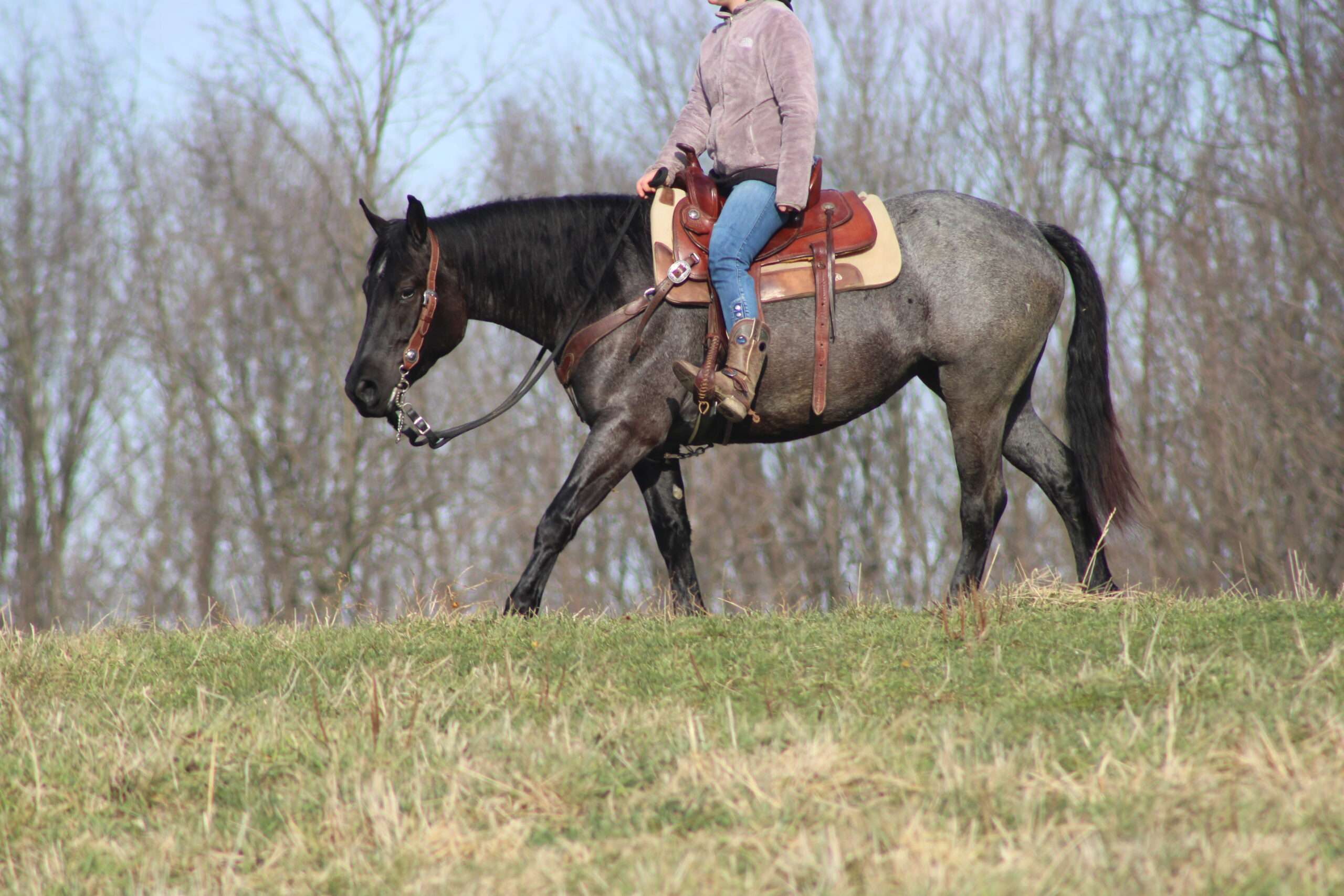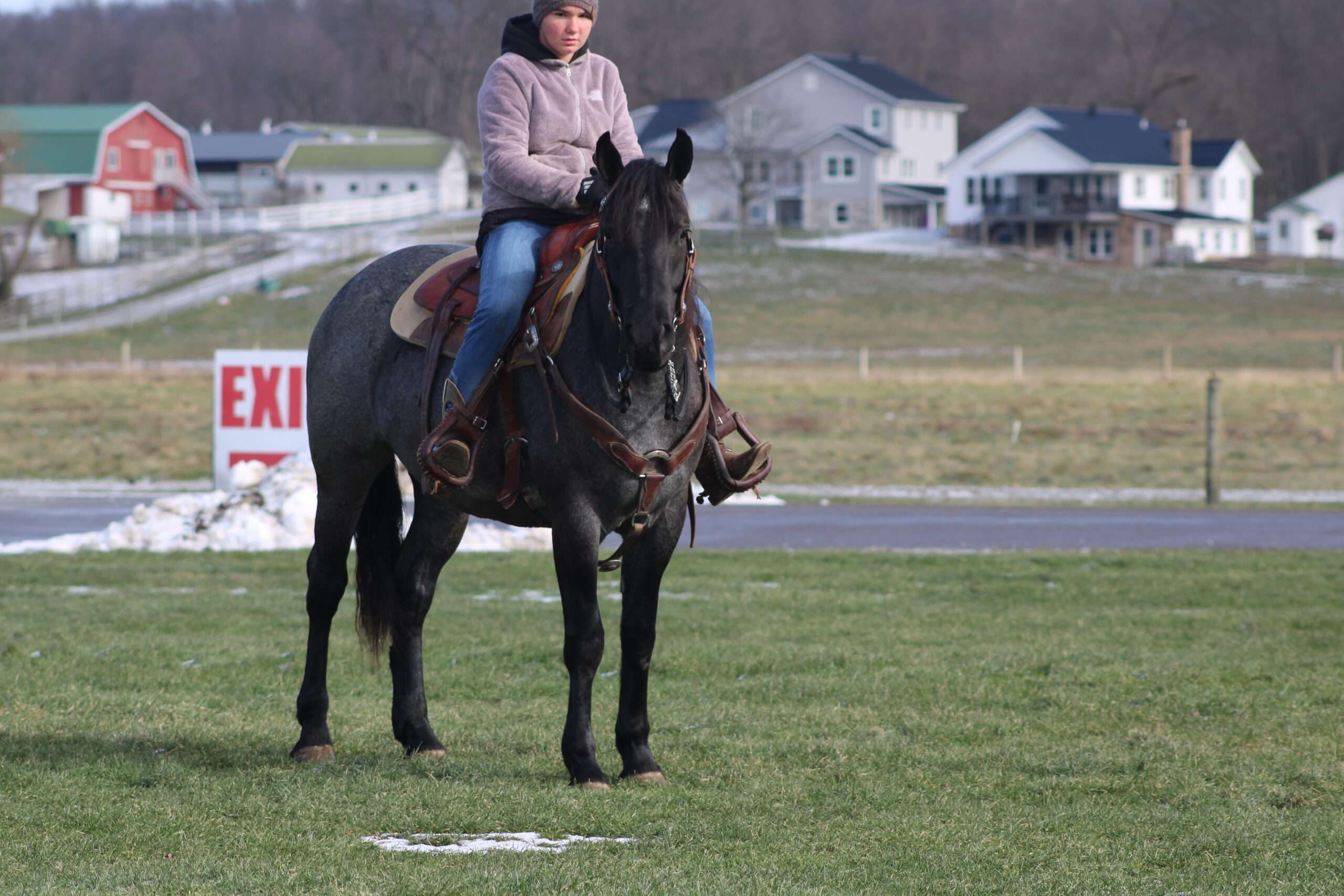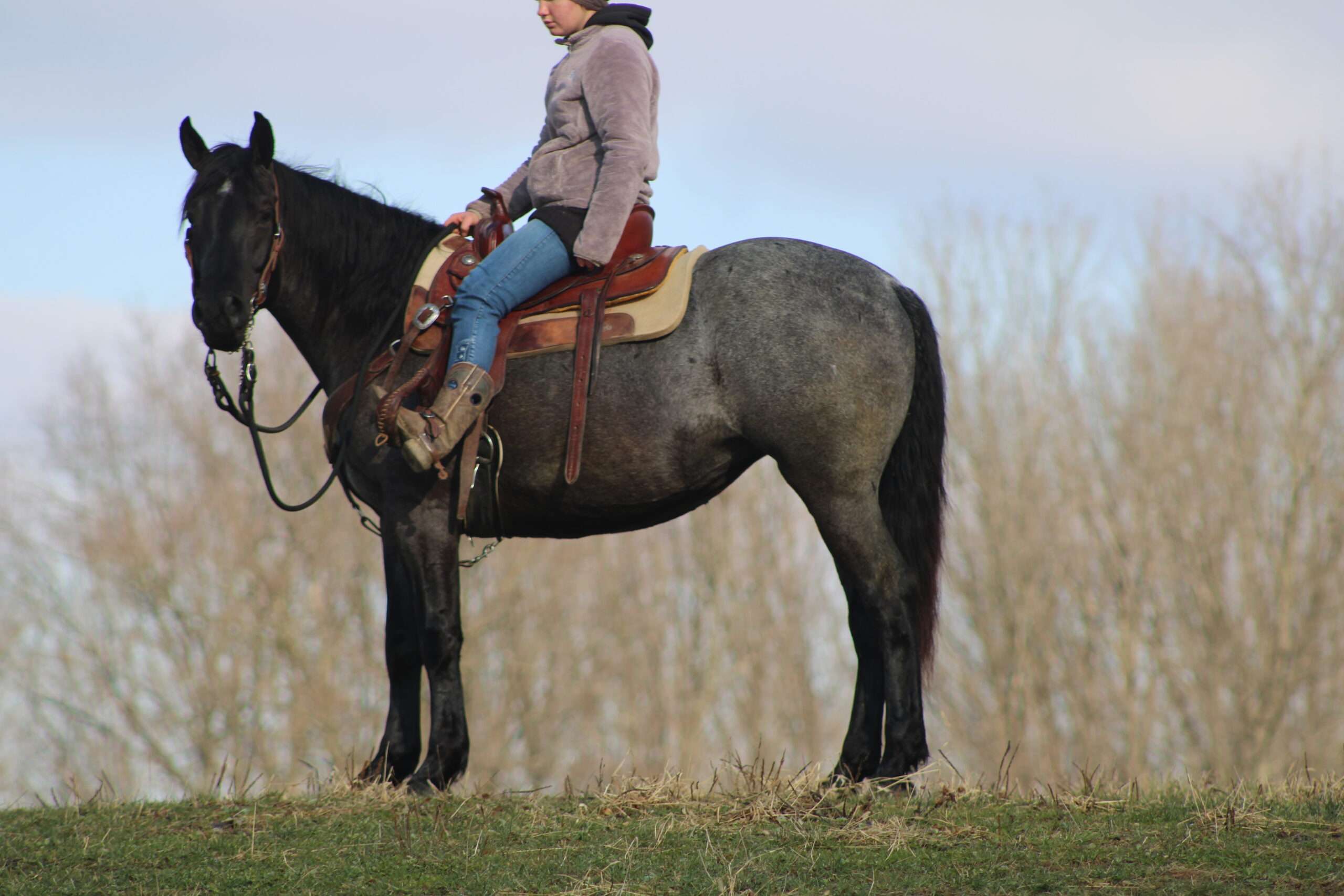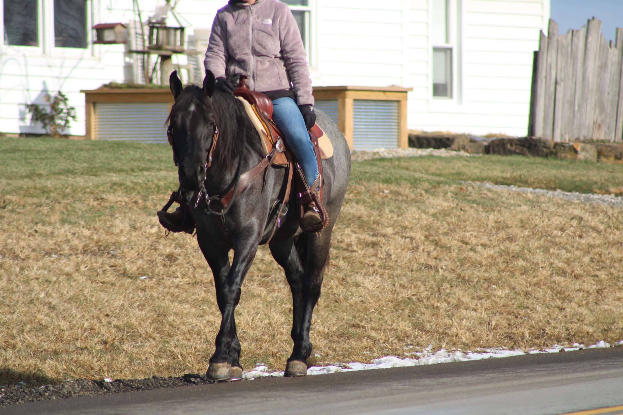 Hershey's Blue Bell is a coming 4 year old Percheron X Quarter Horse mare!! She is very gentle and laid back for her age. "Bell" as we call her most times has been trail ridden a lot and loves to go through water. She is very safe in heavy traffic and doesn't mind the big trucks. Bell picks up both leads and has a nice smooth lope. She stands nice for the farrier and also doesn't mind the clippers. She is easy to catch in the pasture and stands nice to mount. Here is a mare with a lot of future!!! For more info call or text John @ 330-600-0197
